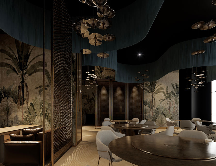 Daytime coffee, nighttime wine – high-end dining design features deep gray-blue fabric bands suspended from the ceiling, connecting and en-circling the entire interior space. The design style is dominated by Art Deco, with rich and elegant details creating a trendy atmosphere in the urban setting. People of all ages will Þnd their place in the space.
